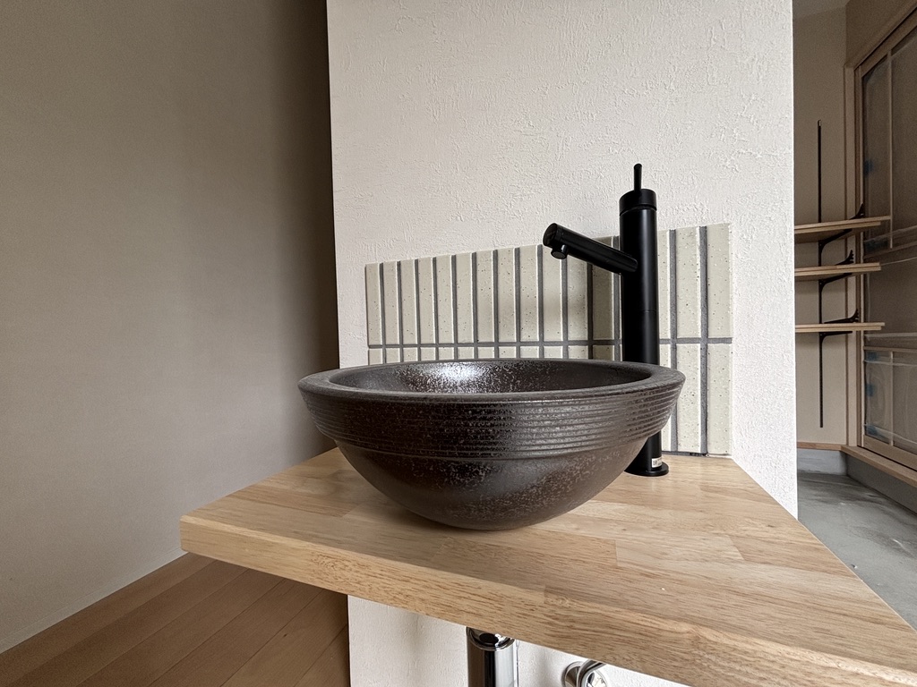 玄関には、帰宅後すぐに使える『おかえり手洗い』を設置。 器の落ち着いた質感とタイルの表情が、和モダンの雰囲気に心地よくマッチ。