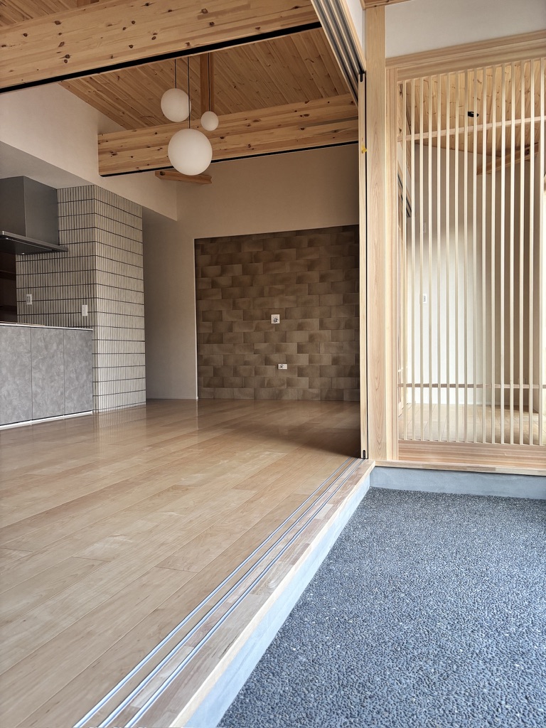 造作格子建て具は玄関土間とのゆるやかな仕切りに。また、必要に応じてスライドしリビングを仕切ることもできます。光をやわらかく通す機能性と、デザインを兼ね備えた建具です。