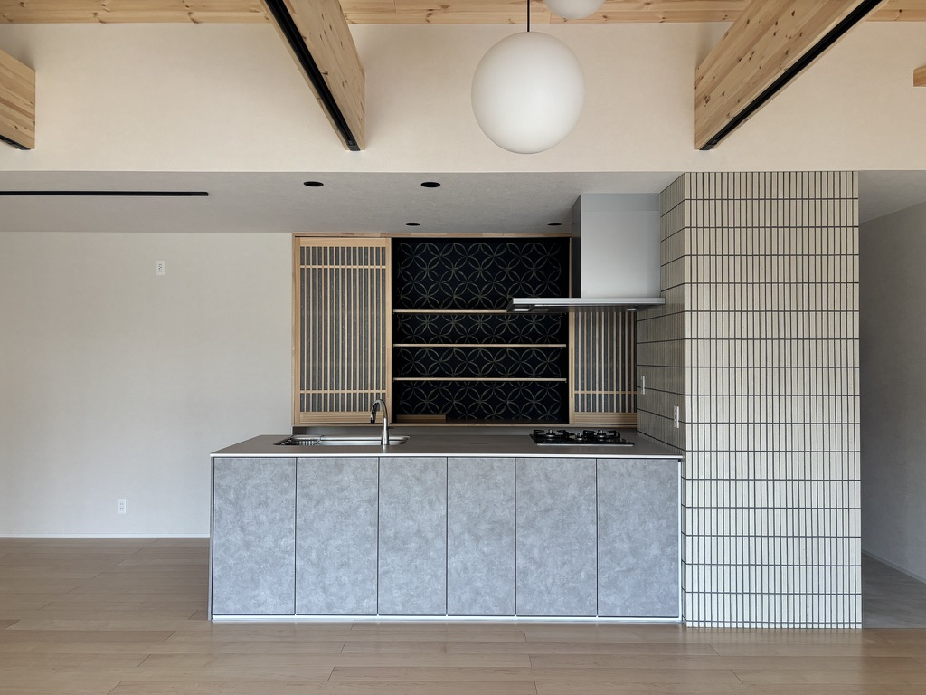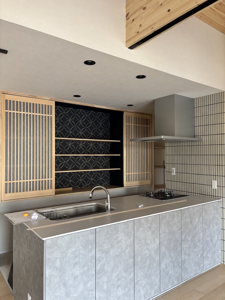 木格子×和紙の引き戸が、キッチンにやわらかな和のニュアンスを添える造作収納。 和柄のクロスとの組み合わせが美しく、上品な和モダンの空気感を生み出しています。