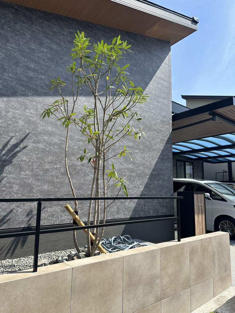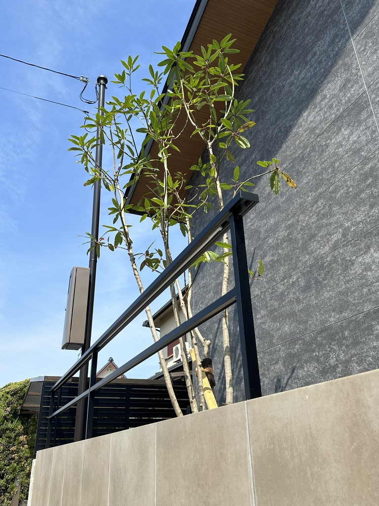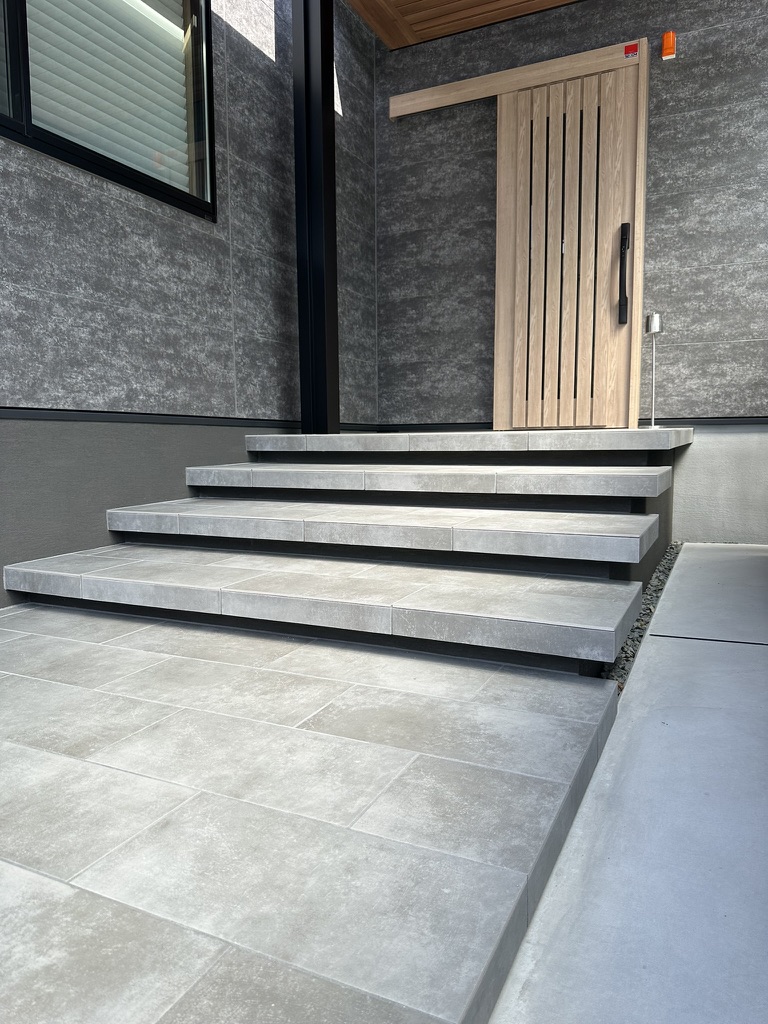 深みのあるダークグレーの外壁に、タイルの塀と木目の軒天を組み合わせ、落ち着きの中にもやわらかさと上質さが漂う外観に仕上げました。