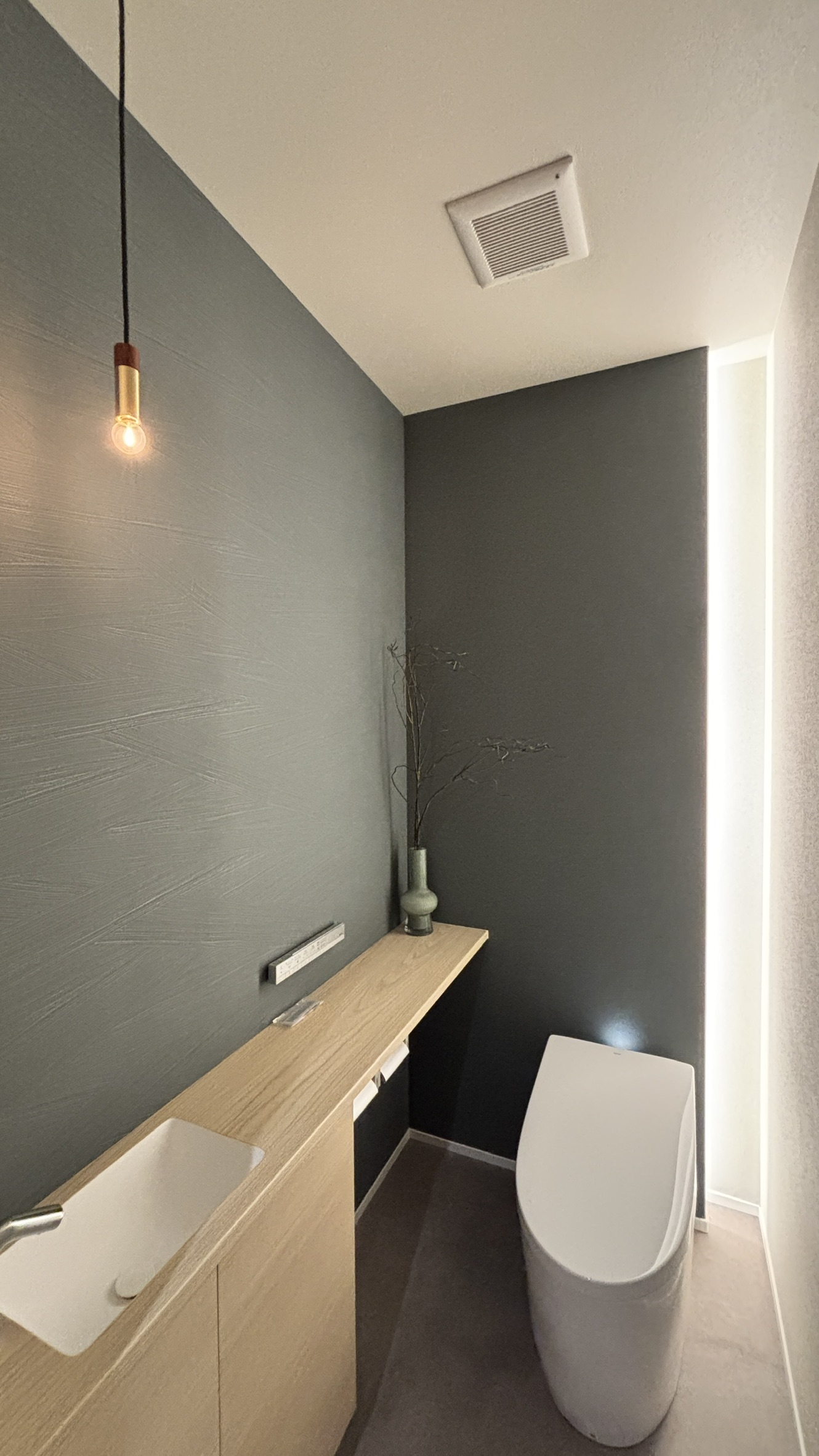 グリーンと木目のやさしい組み合わせが和の空気をつくるトイレ。 間接照明とペンダントを加えて、ほっと落ち着ける和モダンの雰囲気に仕上げました。