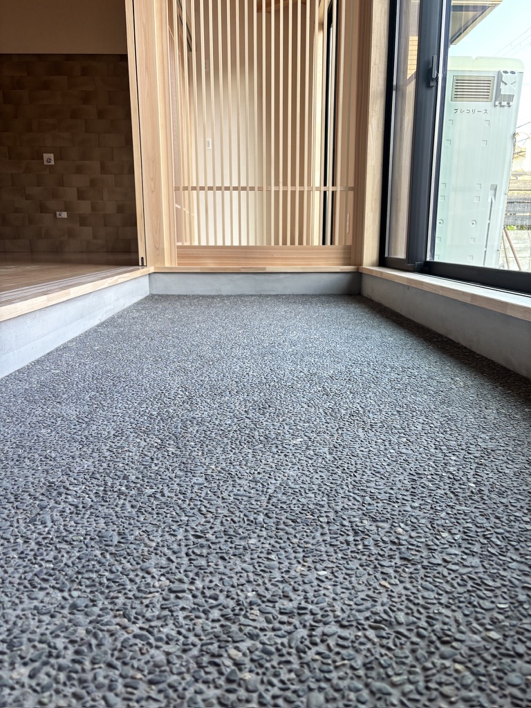 土間の洗い出し仕上げは室内の木の質感とも心地よく馴染む、玄関のこだわりのポイントです。