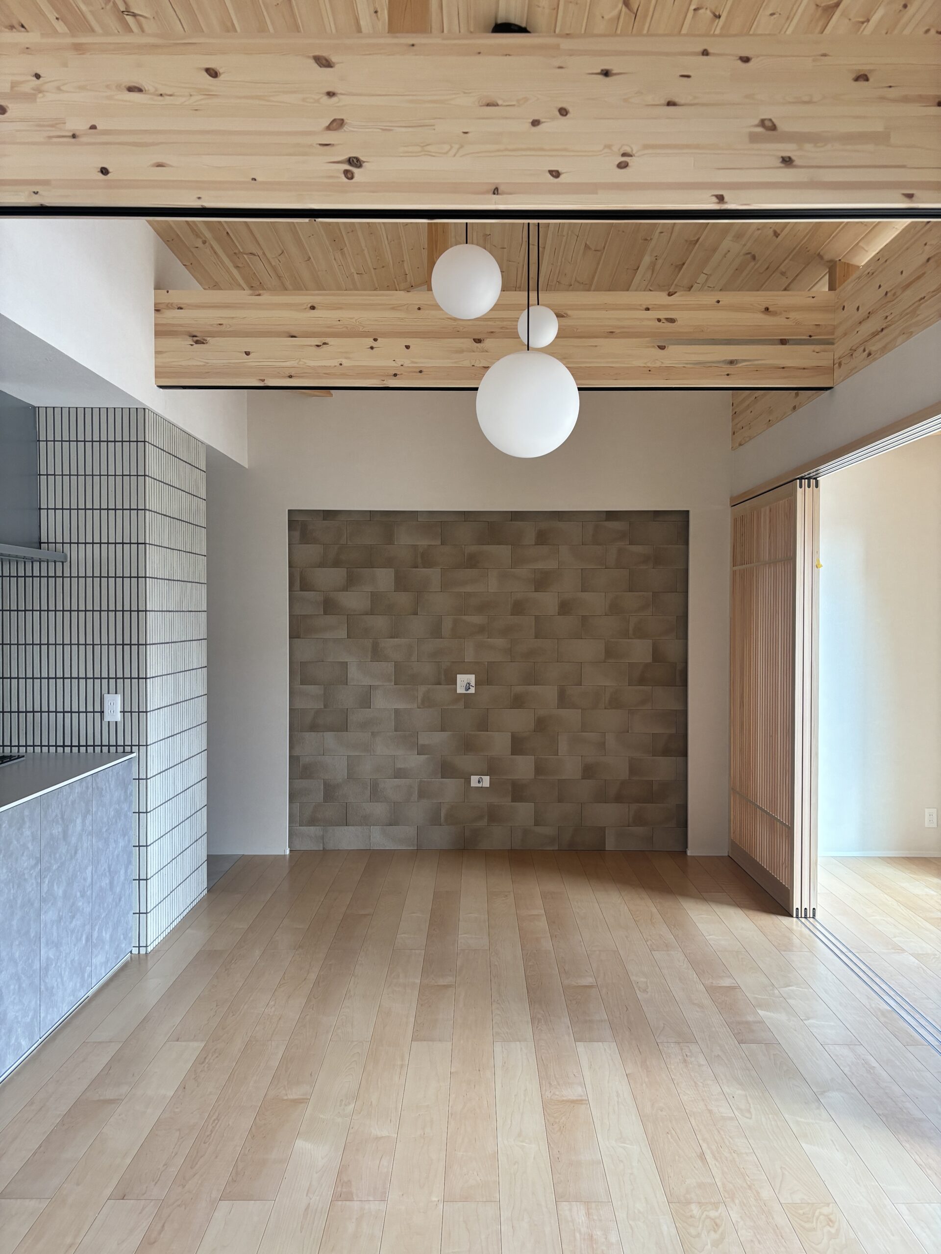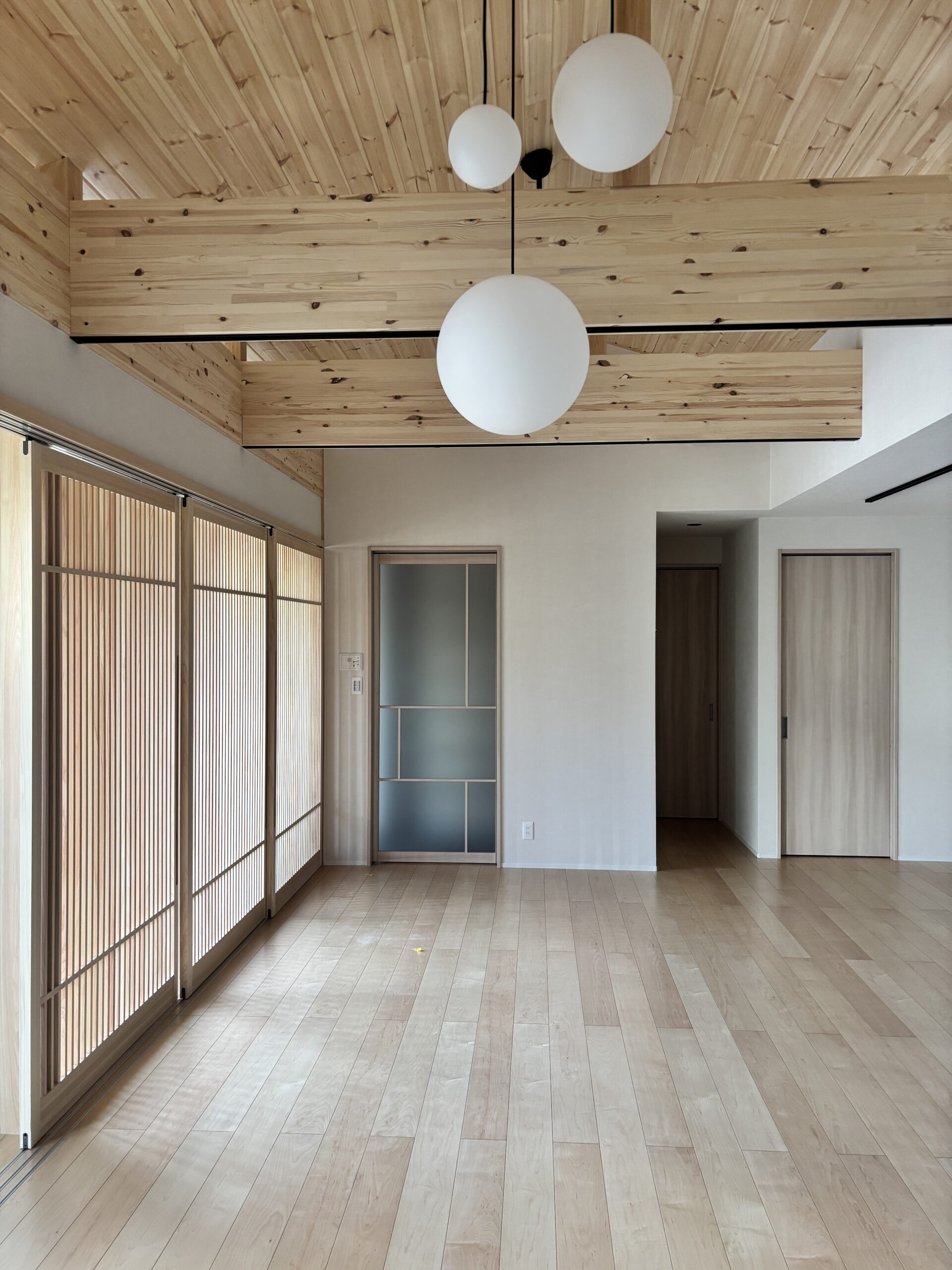梁、丸照明、エコカラット、格子建具。異なる素材を丁寧に組み合わせることで木の温もりと上質さが心地よく調和するLDKになりました。